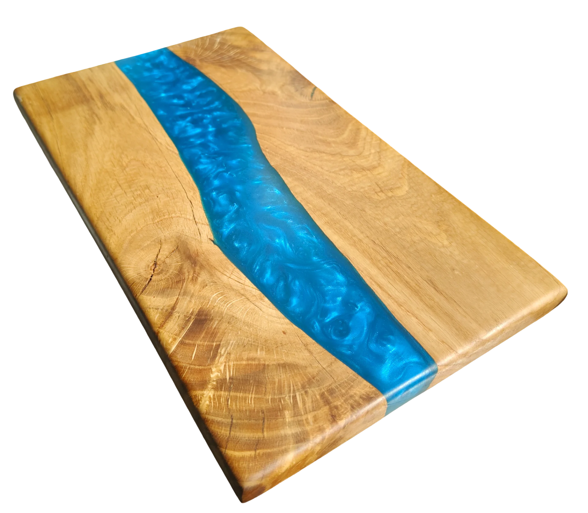 Deska do serów z dębu i turkusowej żywicy wyróżnia się niepowtarzalnym wyglądem, który zachwyci miłośników pięknych przedmiotów. Drewno dębowe, znane z trwałości i bogatej tekstury, zostało starannie dobrane, aby każda deska posiadała unikalny rysunek słojów. Kontrastuje z nim żywica w odcieniu turkusu, która przypomina spokojne, egzotyczne wody i nadaje całości nowoczesnego charakteru.