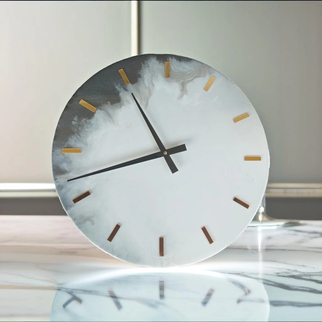 Zegar dekoracyjny ścienny wykonany z żywicy to nie tylko funkcjonalny element wyposażenia, ale też nowoczesna forma sztuki. Stylowa kompozycja bieli i złota wpisuje się w aktualne trendy wnętrzarskie – szczególnie w aranżacjach glamour, minimalistycznych i modern classic. Dzięki swojej średnicy 50 cm zegar idealnie wypełnia pustą przestrzeń na ścianie, stając się głównym punktem dekoracyjnym pomieszczenia.