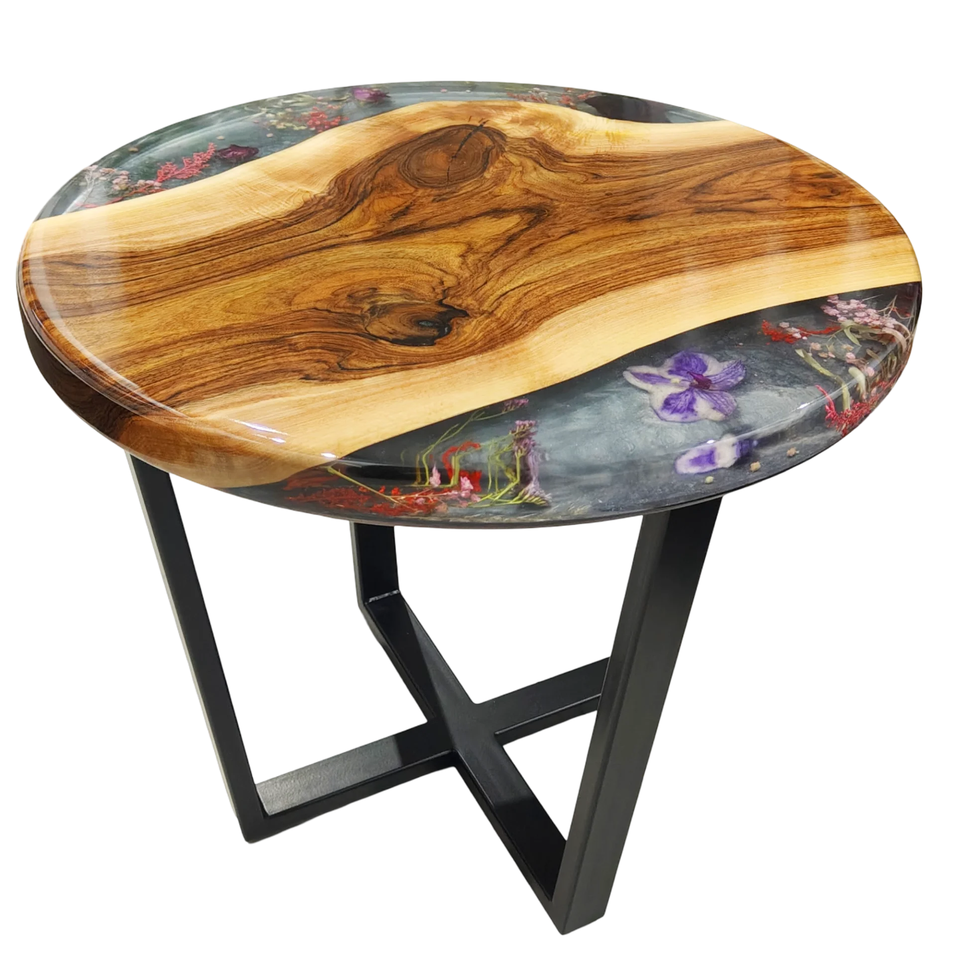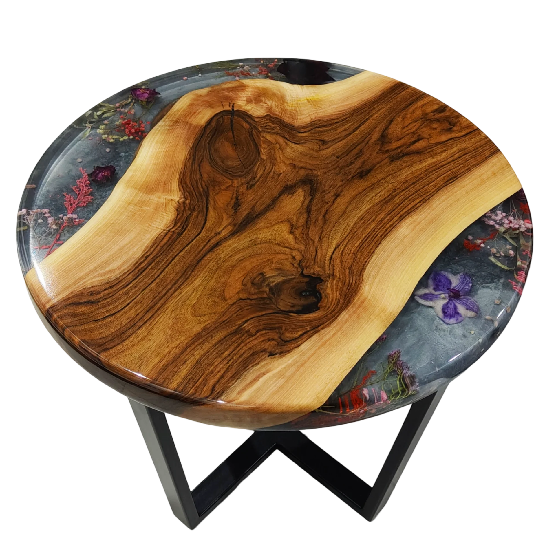 Stolik z orzecha z zalanymi kwiatami w żywicy – Ciepło Natury