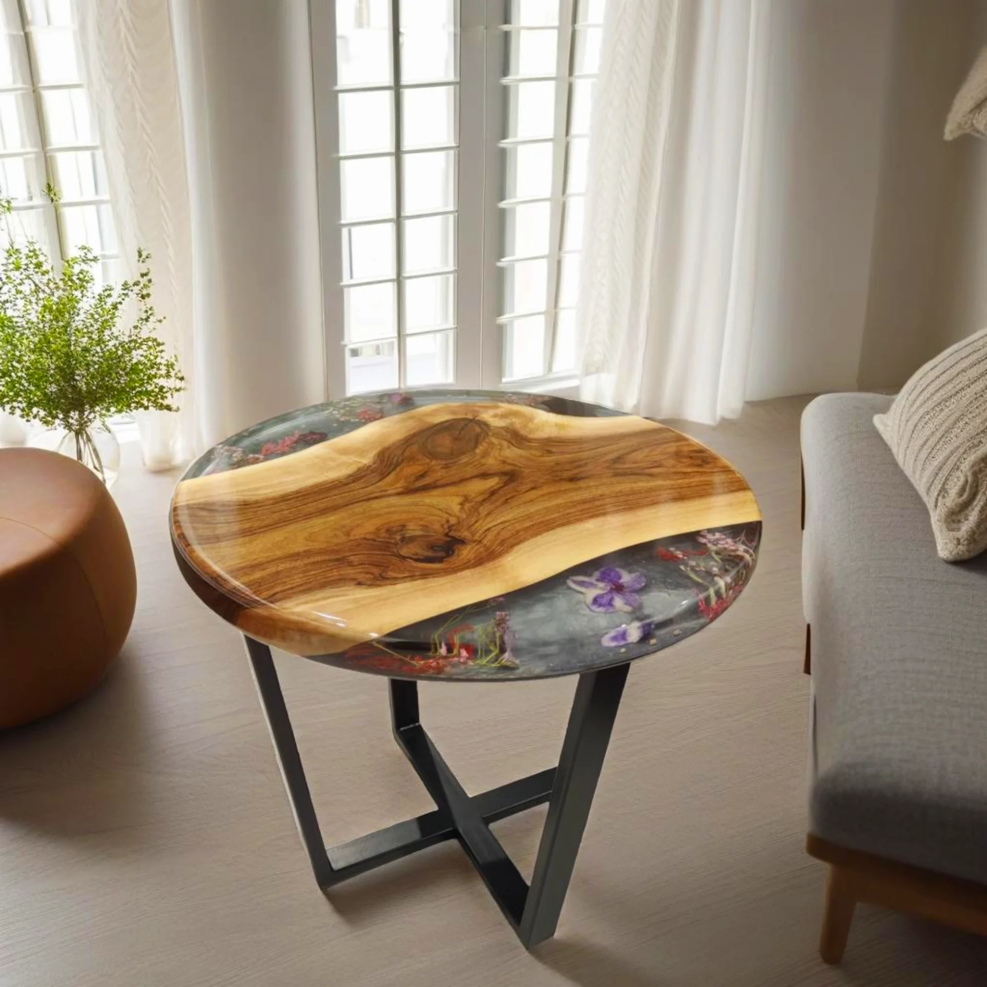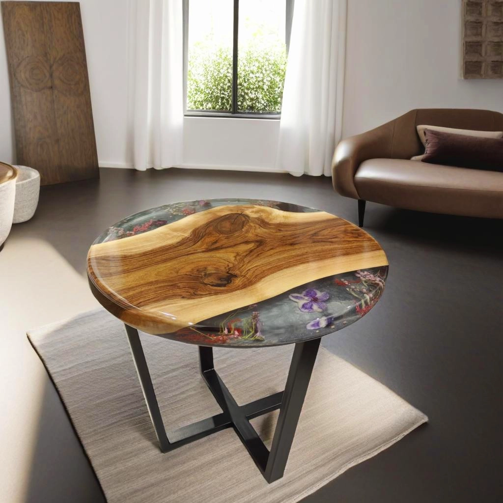 Okrągły Stolik z Orzecha z Kwiatami w Żywicy 60cm w salonie