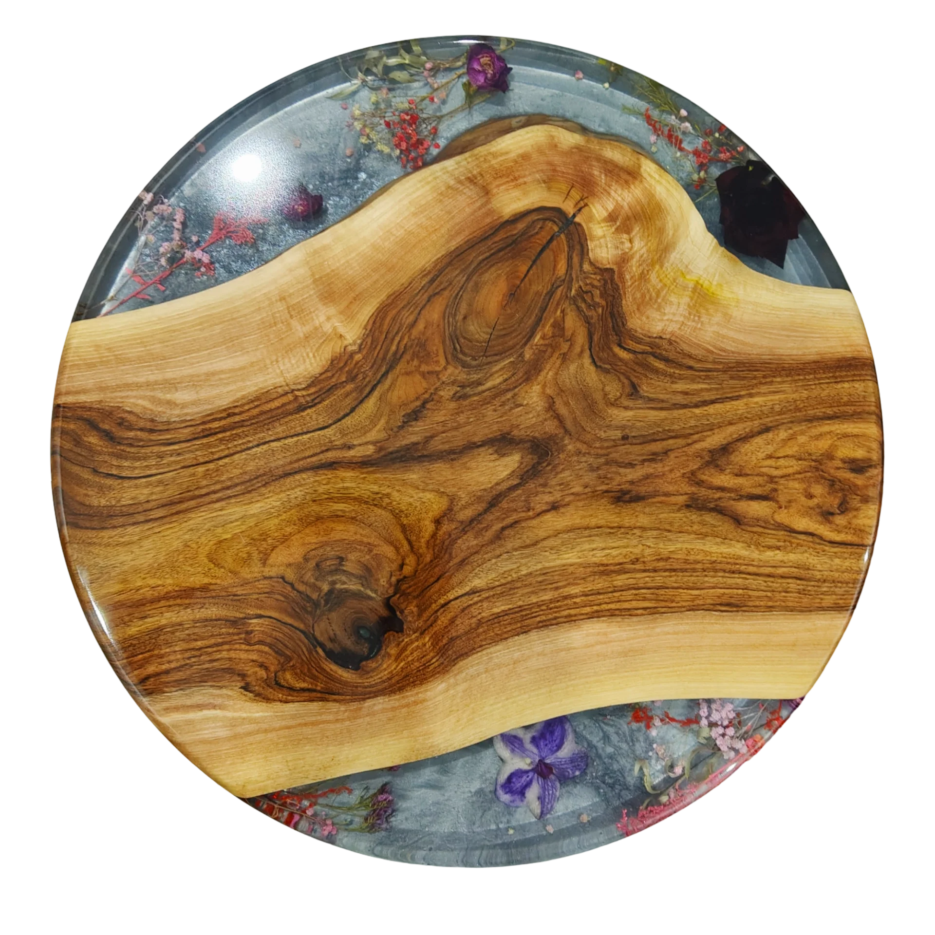 • Inkrustacja: suszone kwiaty zatopione w przejrzystej żywicy epoksydowej o subtelnie dymionym tle.