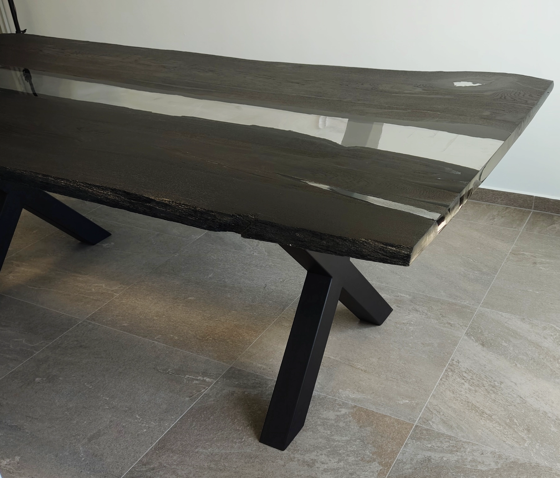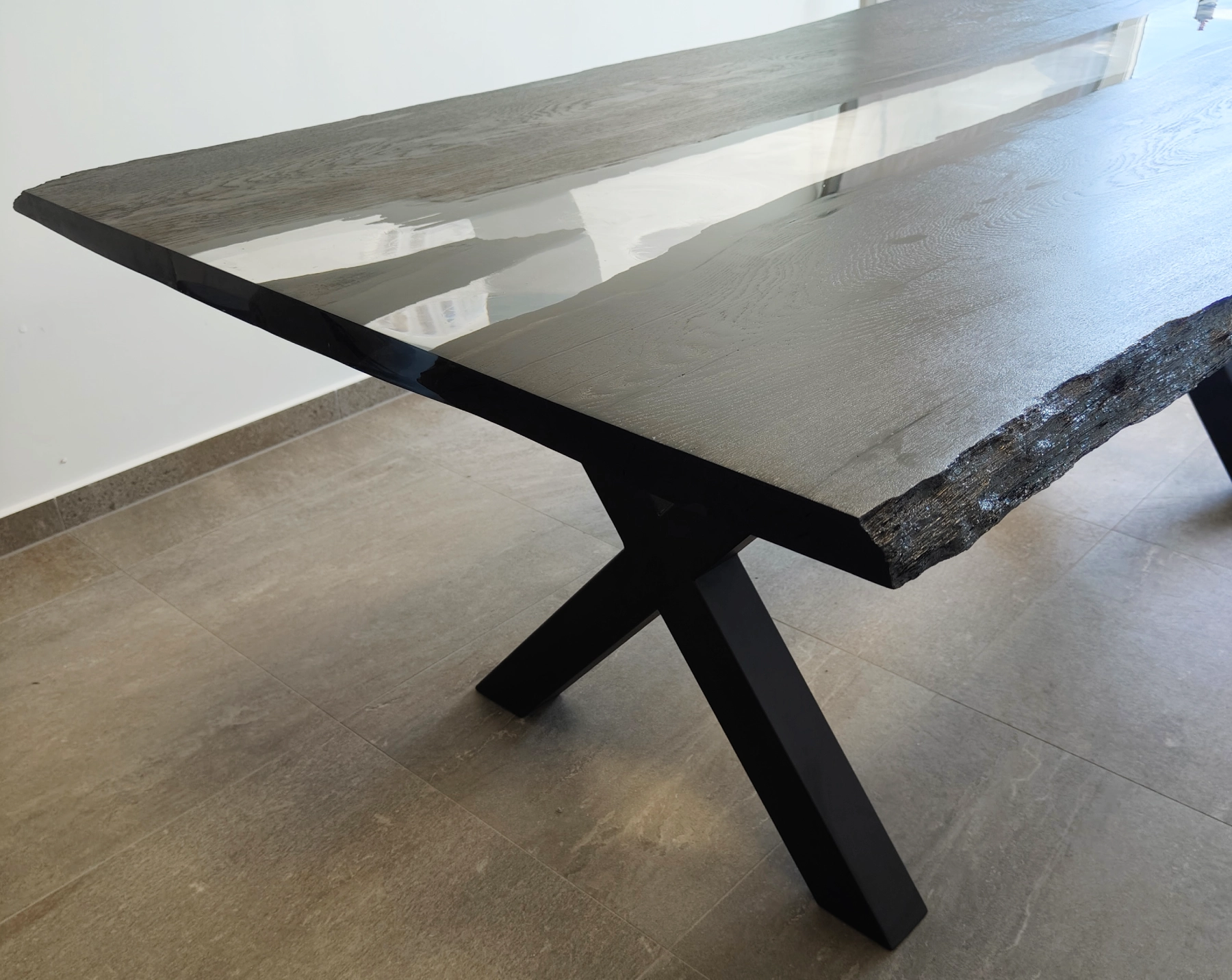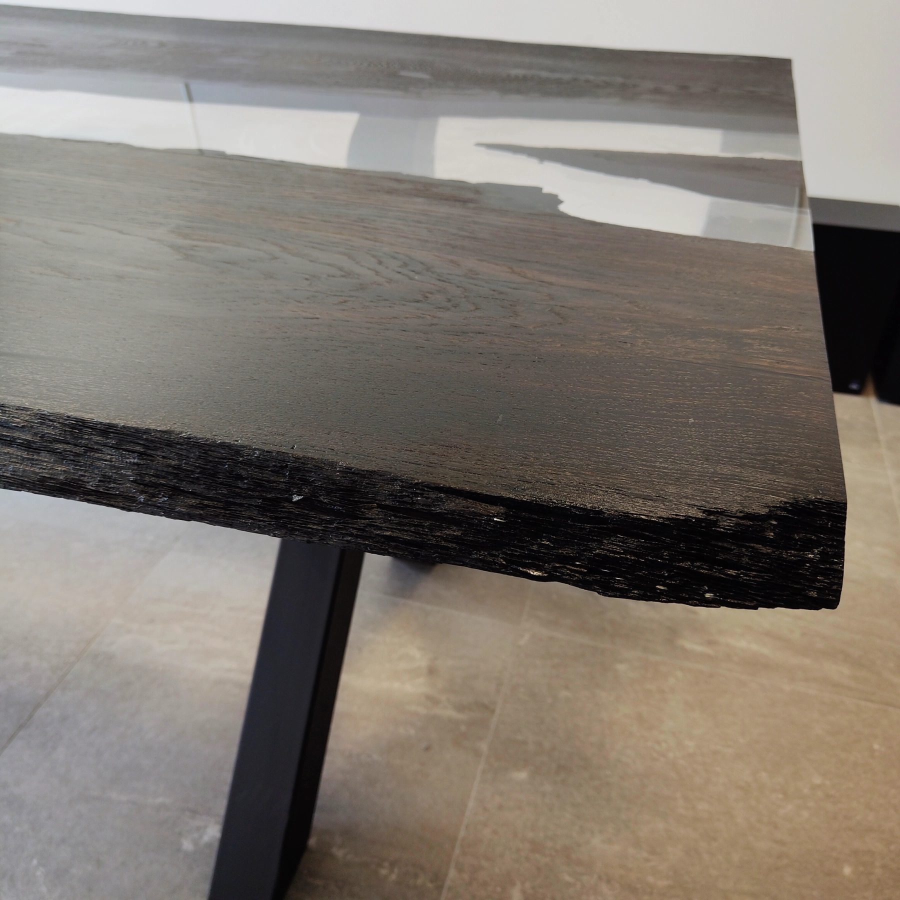 Stół Konferencyjny z Drewna Czarny Dąb 1700 lat to wyjątkowy stół został wykonany z czarnego dębu liczącego ponad 1700 lat (potwierdzone certyfikatem), co czyni go nie tylko meblem, ale również unikalnym świadectwem historii natury. Blat stołu łączy w sobie naturalne, surowe piękno drewna o satynowym wykończeniu z nowoczesną, transparentną żywicą epoksydową o wysokim połysku, tworząc efekt „rzeki” i nadając całości niepowtarzalny, elegancki charakter.