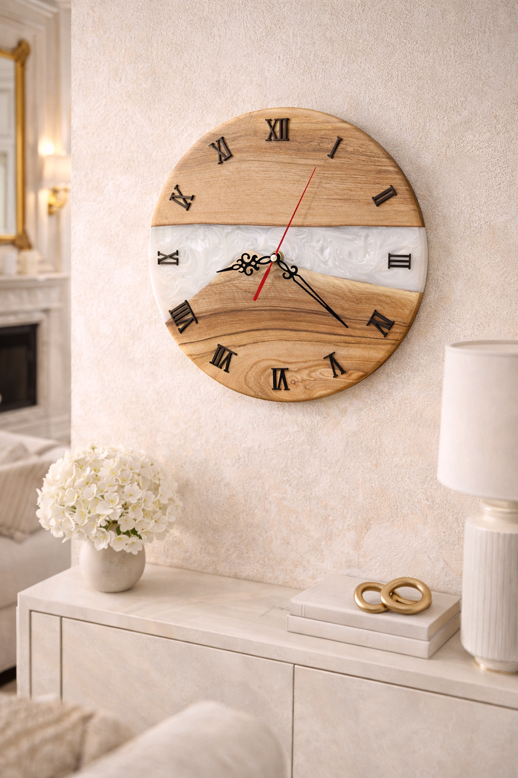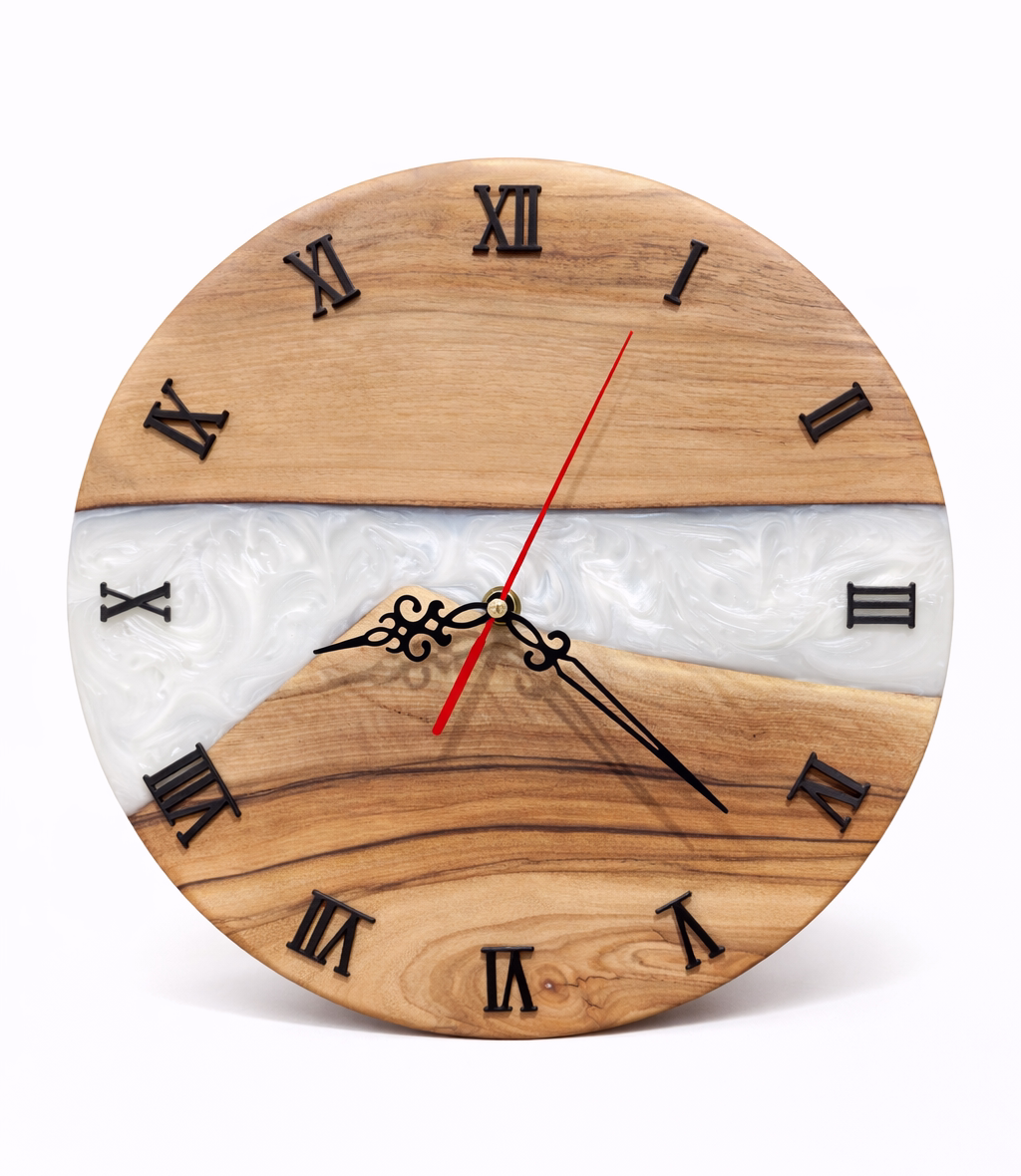 Ten zegar ścienny z drewna orzecha i białej żywicy epoksydowej o średnicy 30 cm to połączenie naturalnego piękna drewna z nowoczesną, artystyczną formą. Jasna, mlecznobiała żywica płynnie kontrastuje z ciepłym, głębokim rysunkiem orzecha, tworząc efekt eleganckiej „rzeki”, która nadaje zegarowi wyjątkowy, luksusowy charakter.