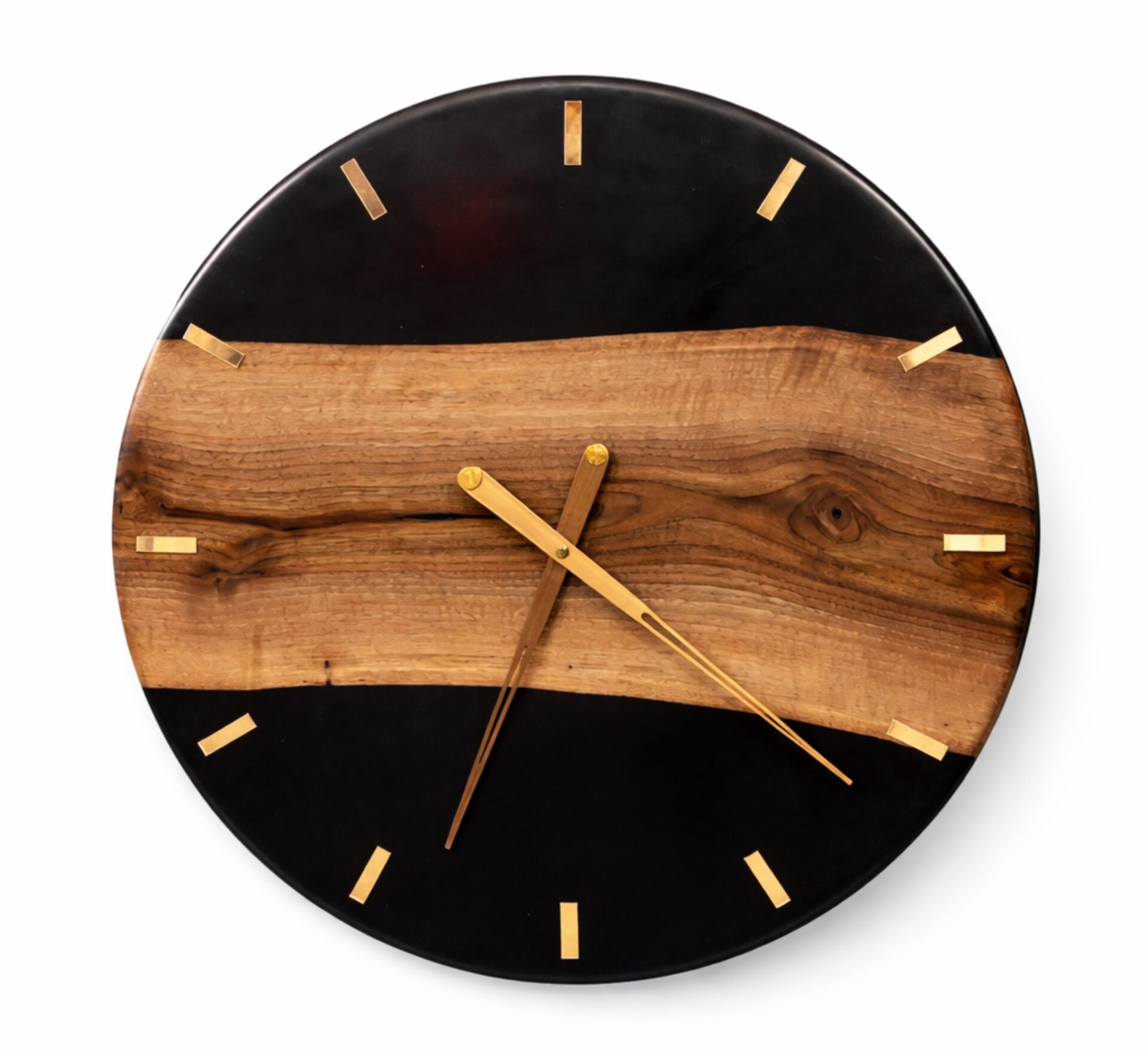 Wyjątkowy zegar ścienny wykonany z naturalnego drewna orzecha połączonego z głęboką, czarną żywicą epoksydową. Centralny pas drewna o wyraźnym usłojeniu kontrastuje z elegancką, satynową czernią, tworząc nowoczesną, a jednocześnie ponadczasową formę. Złote wskazówki i minimalistyczne indeksy nadają całości luksusowy charakter i podkreślają klasę ręcznego rzemiosła.